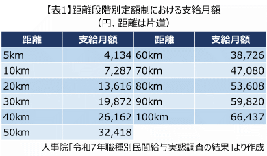 距離段階別定額制を採用している企業における、通勤手当の支給月額(平均支給額)をまとめると、表1のとおりです。