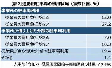 次に、自動車通勤者の通勤用駐車場の利用状況をまとめると、表2のとおりです。