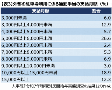 従業員が自ら借りた外部の駐車場を利用する場合に、駐車場利用に係る通勤手当を支給する企業は29.9%でした。この場合の通勤手当の支給月額をまとめると、表3のとおりです。